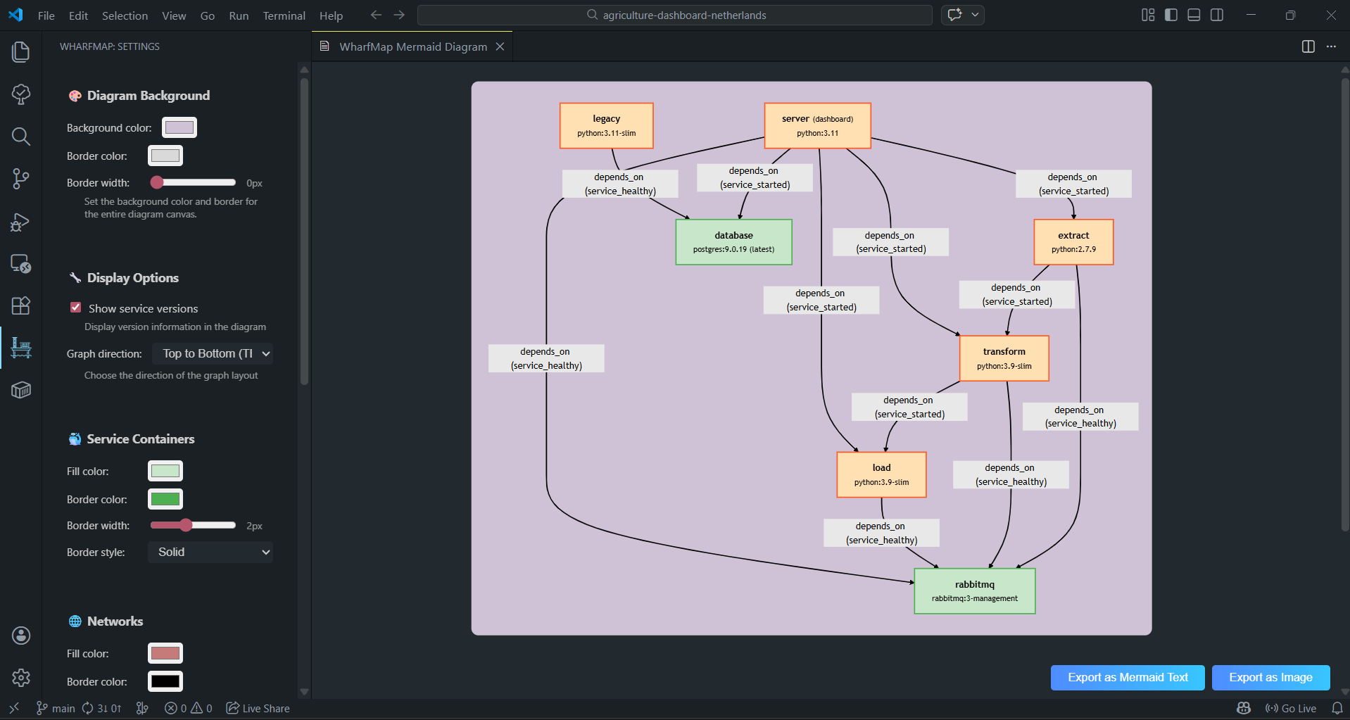 - The visualization will display your services, dependencies, and networks using Mermaid diagrams